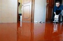 The cat doesn't like it when i wax the floor