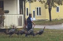 My friend's neighborhood rafter of wild turkeys have taken to following the mailman around as he walks from house to house, like some kind of avian pied piper.
