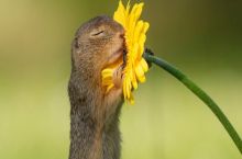 Squirrel smelling dandelion