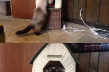 This shelter cat named Quilty kept opening the door to let all the cats out, so the staff rigged up a broom to keep the door closed. Quilty is not happy about this.