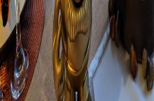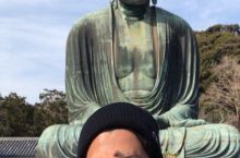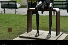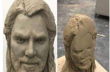 Grinning statue with a plain faced man