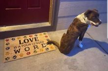 Friend's mom sent her a welcome mat. Her dog has three legs. Dog's face says it all.