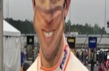 NASCAR driver Denny Hamlin wears a mask with his own face on it, before the race.