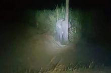A young elephant tries to hide behind a lamppost after it was caught eating sugar cane in a Thai field