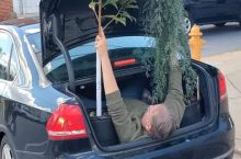 This guys is laying down in the car hatch and holding these two plants as his wife who is driving keeps yelling "what" as he keeps yelling something about "pull over for a second" LOL