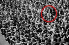 Man brings a red hula hoop to a Nazi Rally in Berlin,