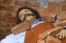 A WW2 Italian soldier lying in a pile of bricks after the building was shelled by Allied bombs