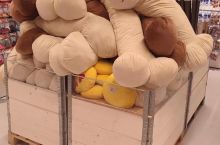 A big pile of happy plushies in the middle aisle of a Big Dollar shop